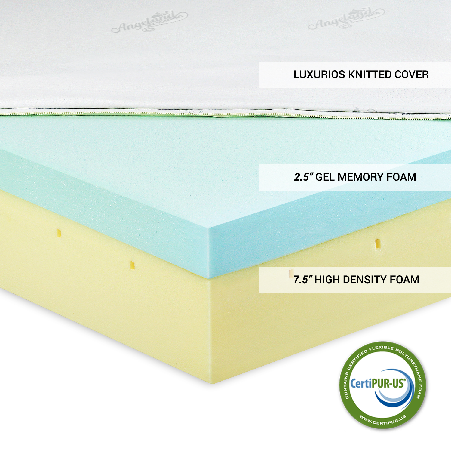 - Dual Layer 10-IN Open cell memory foam; 2.5-IN luxurious gel-infused memory foam plus 7.5-IN HD responsive base layer of premium polyurethane foam base, 100% CertiPur-US Certified Foam.