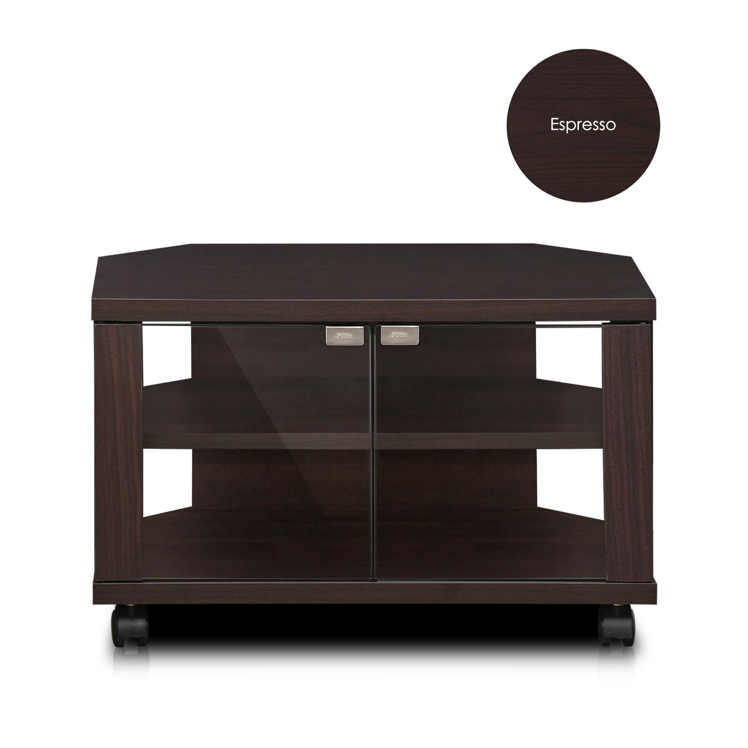 Furinno Indo 3-Tier Petite TV Stand with Double Glass Doors and Casters