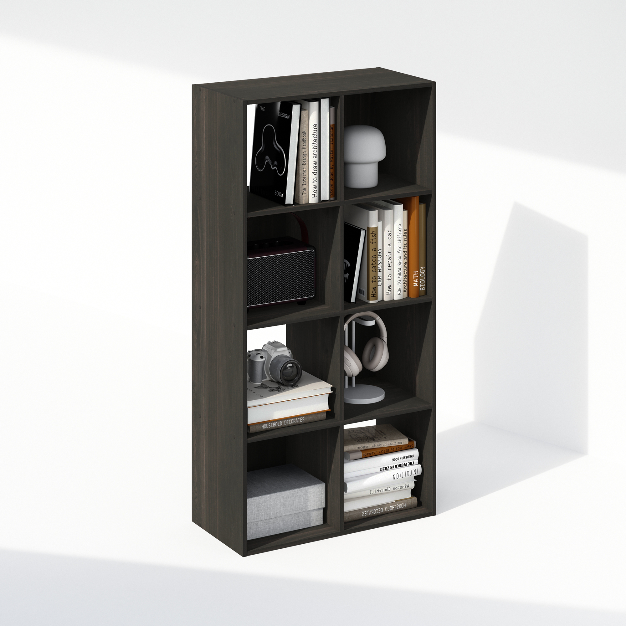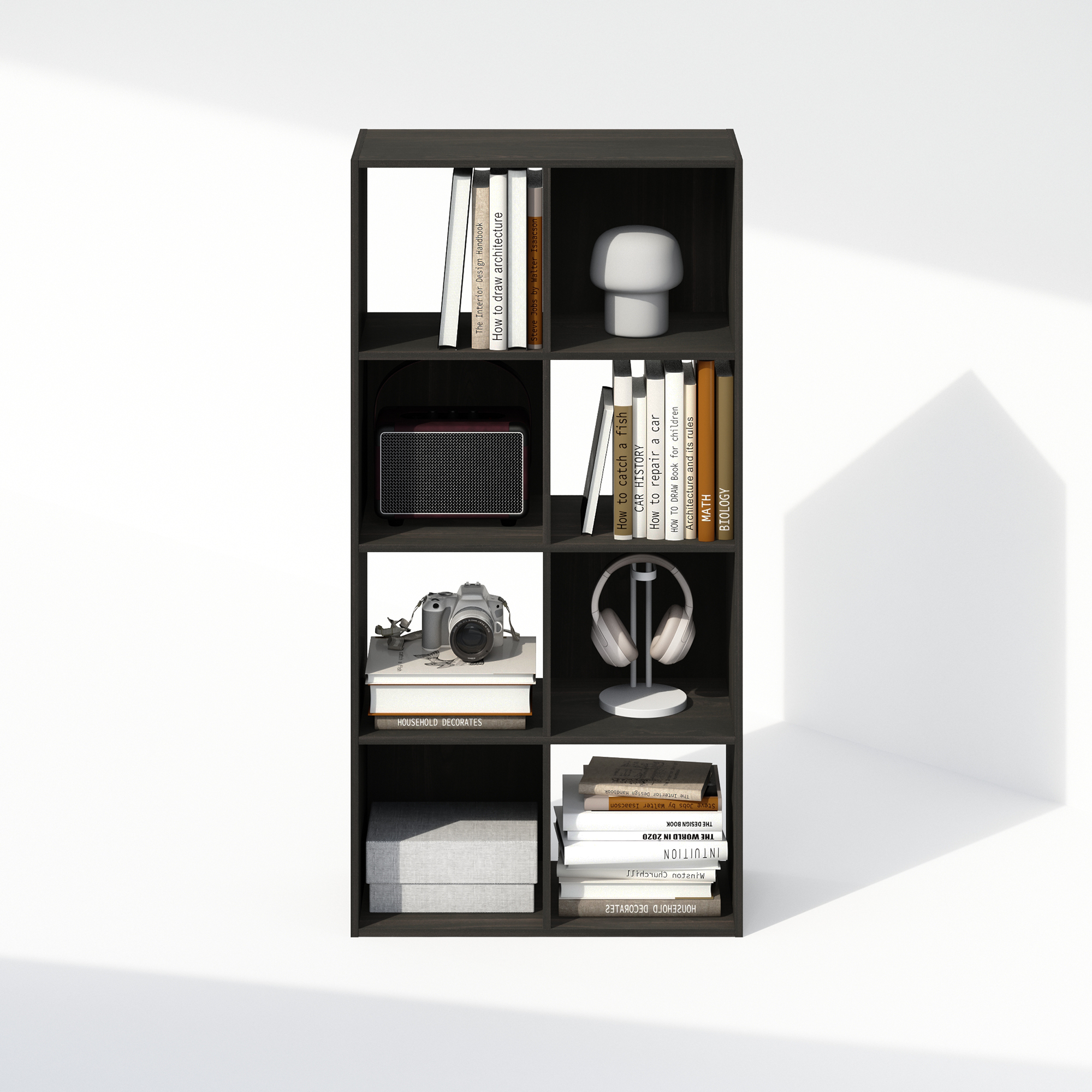 - This bookcase features 8 cubes, each with a weight capacity of 20 lbs.